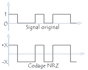 Le codage NRZ (signifiant No Return to Zero, soit Non Retour à Zéro) est le premier système de codage, car le plus simple. Il consiste tout simplement à transformer les 0 en -X et les 1 en +X, de cette façon on a un codage bipolaire dans lequel le signal n'est jamais nul. Par conséquent, le récepteur peut déterminer la présence ou non d'un signal.